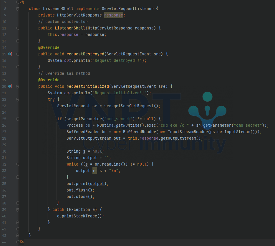 mỗi khi request được thực hiện. Lợi dụng class này ta có thể override lại hai method trên để gọi lệnh thực thi OS command, ở đây mình sẽ override method requestInitialized()