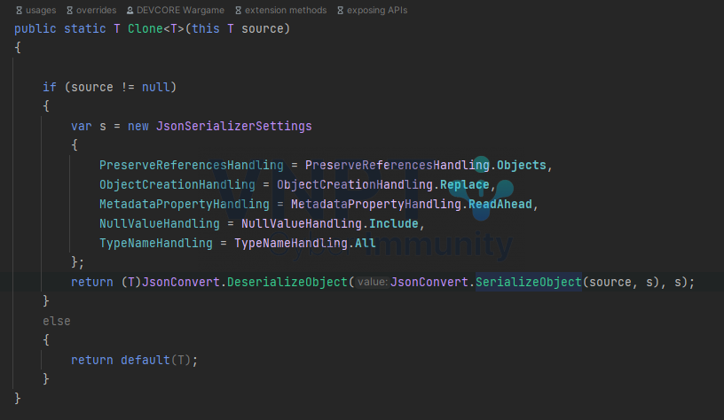 Đọc sơ source code thì xác định được lỗi Json.Net Deserialization tại LOC 20 - /Extensions/WebExtension.cs, khi các settings của JsonSerializerSettings tại TypeNameHandling được setup thành TypeNameHandling.All và MetadataPropertyHandling được setup thành MetadataPropertyHandling.ReadAhead.