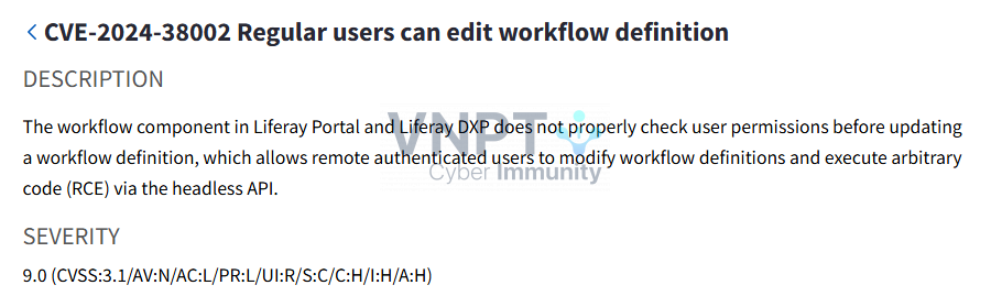 Mấu chốt và cũng là điều kiện chính của CVE này nằm ở việc phân quyền không đúng chức năng của API Headless trong định nghĩa Workflow. Ngoài ra, để trigger được Groovy code trong Workflow thì Workflow đó phải đang được sử dụng và chỉ có admin mới có thể làm được điều đó. Do đó kịch bản thường thấy sẽ là attacker cố gắng chỉnh sửa tất cả các Workflow đang được publish rồi ngồi đợi con mồi của mình sập bẫy thui. Các bản vá cũng đã khắc phục được lỗ hổng này bằng cách giới hạn lại quyền truy cập và thực hiện các API Headless. Nếu không muốn update version, các nhà phát triển có thể tự patch bằng cách mà Liferay đã fix đó là tạo thêm một classcom.liferay.portal.workflow.kaleo.service.impl.KaleoDefinitionServiceImpl