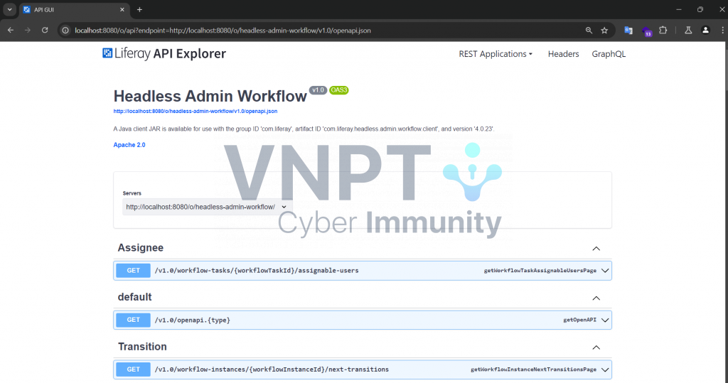 API Headless của Liferay cho phép tương tác theo chuẩn RESTful giúp việc triển khai và sử dụng trở nên đơn giản hơn. Truy cập tại path/o/api, các API này có thể truy cập và sử dụng tùy theo quyền hiện tại của người dùng xác thực. API headless của Workflow: