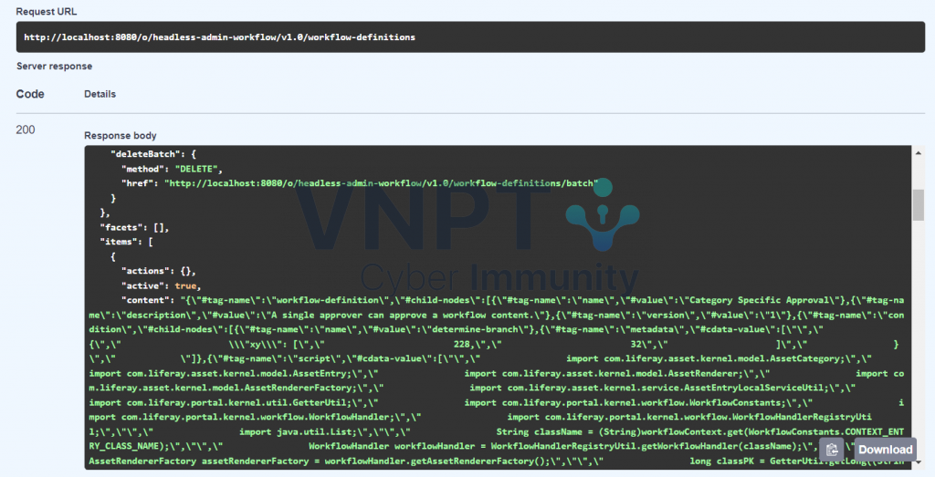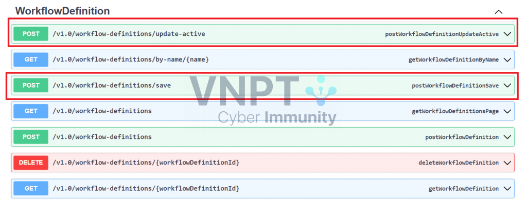 Sau một hồi mày mò thì mình thấy rằng người dùng xác thực có thể sử dụng API /v1.0/workflow-definitions để list được thông tin của tất cả các Workflow đã được định nghĩa. Các API thêm, chỉnh sửa Workflow khác đều đã bị giới hạn quyền truy cập ngoại trừ 2 API /v1.0/workflow-definitions/save và /v1.0/workflow-definitions/update-active