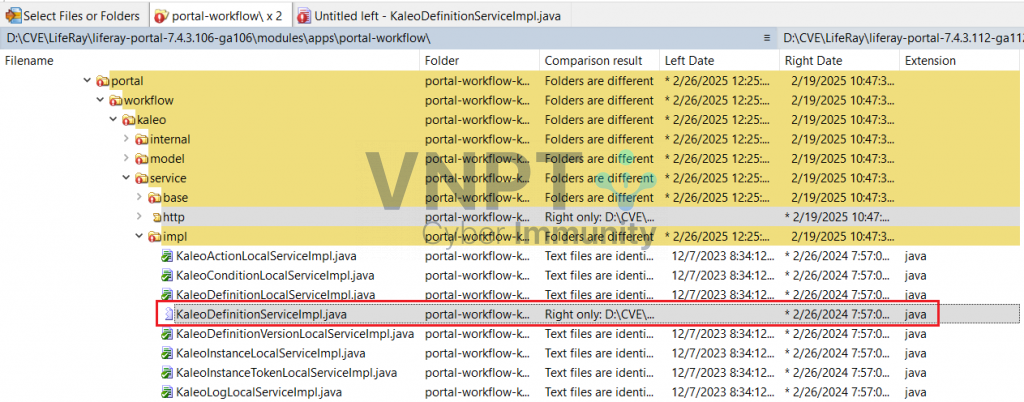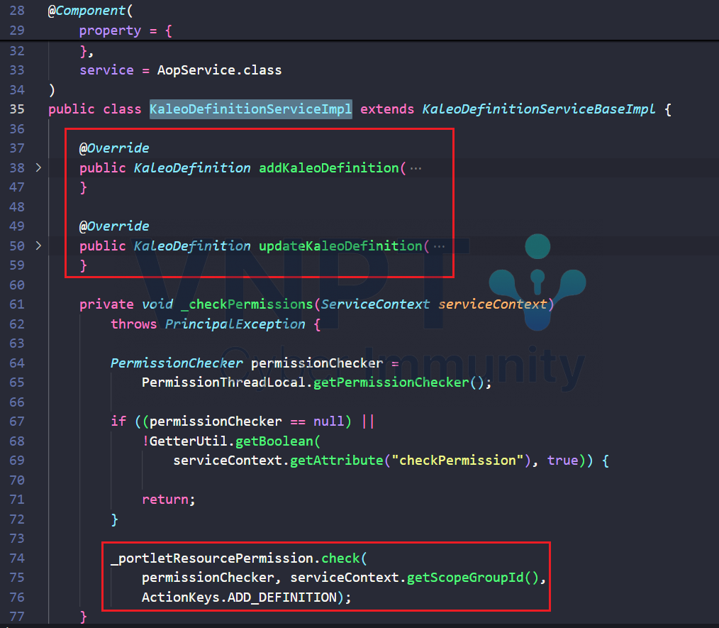 Thực hiện diff code với phiên bản đã fix là 7.4.3.112, mình nhận thấy Liferay đã tạo thêm một class com.liferay.portal.workflow.kaleo.service.impl.KaleoDefinitionServiceImpl