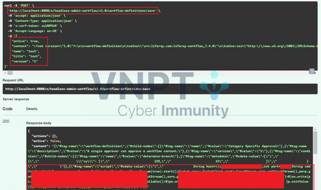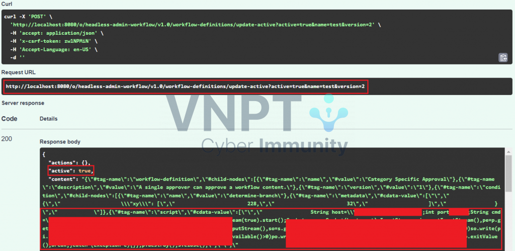 Sử dụng thông tin của Workflow có sẵn, thay thế content (Dữ liệu XML của Workflow dưới định dạng JSON) thành dữ liệu chứa code Groovy RCE và update thông qua API /v1.0/workflow-definitions/save