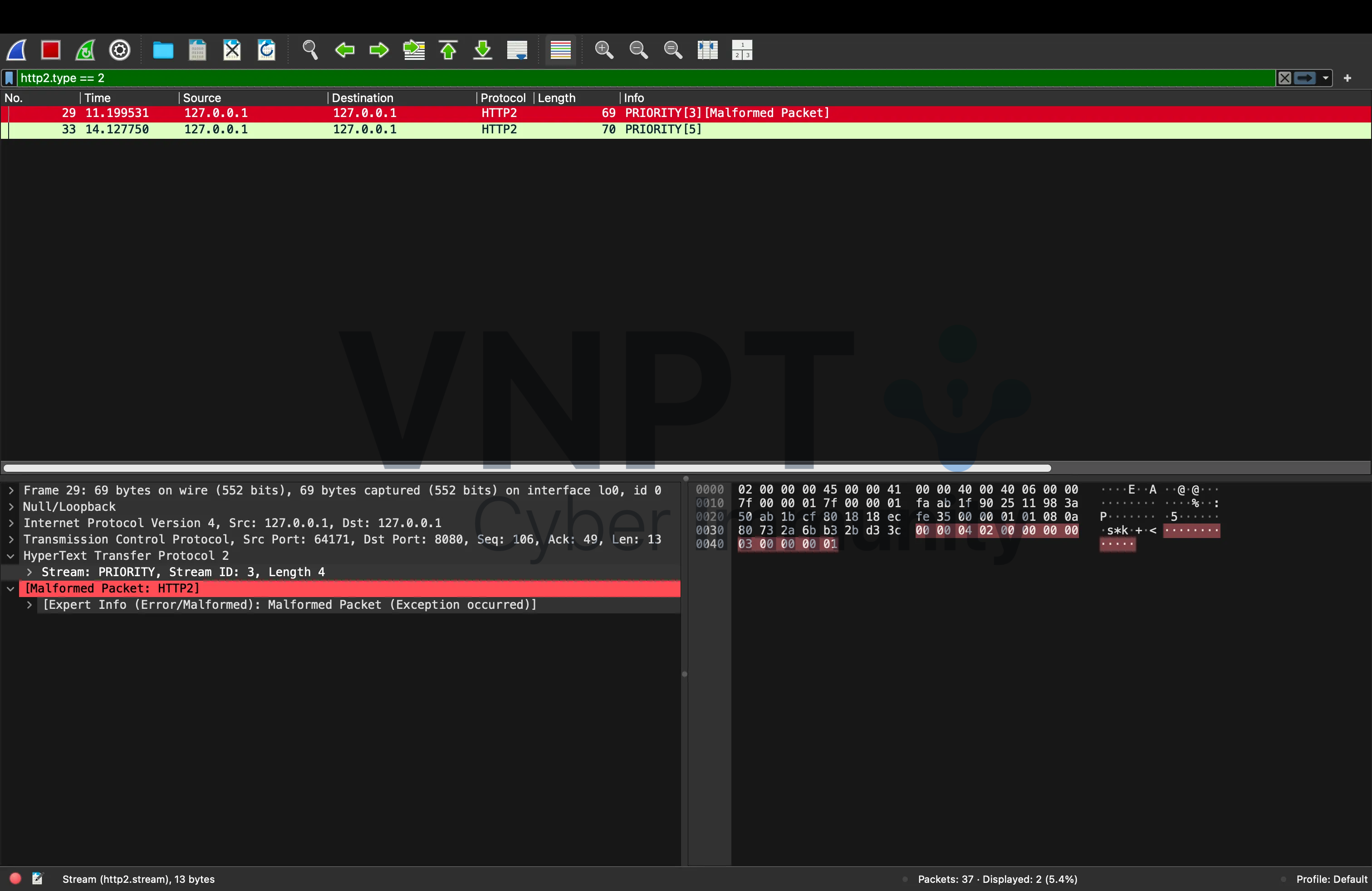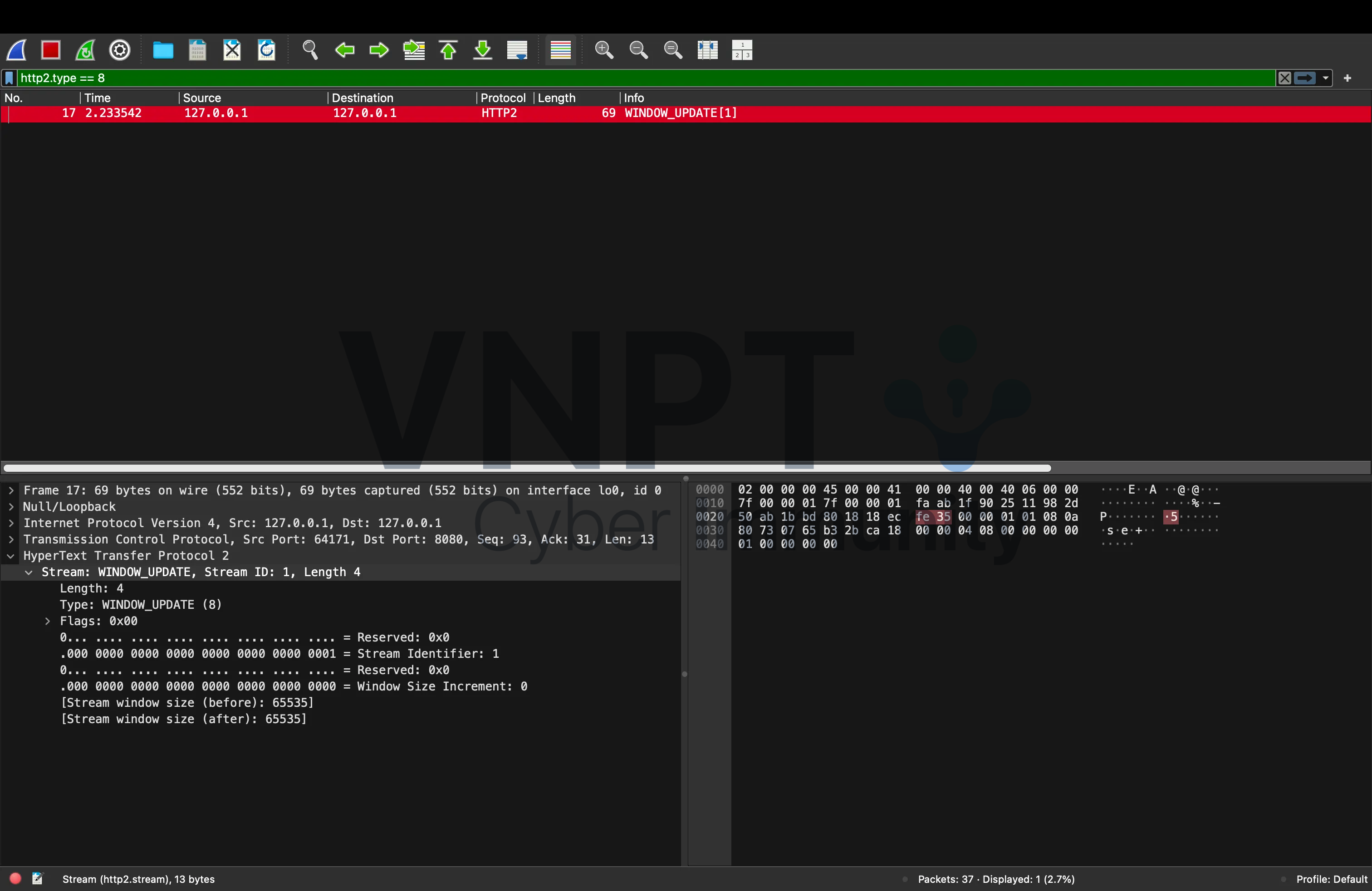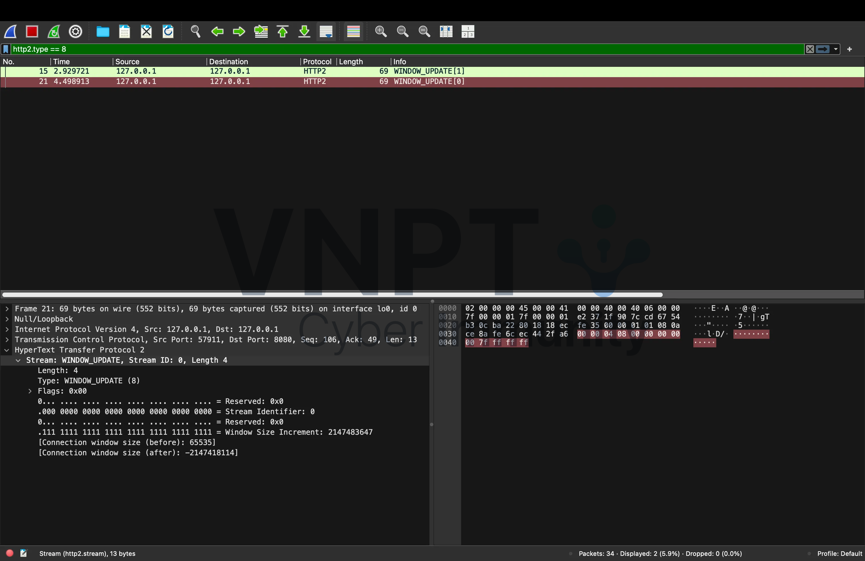 Kích hoạt Lỗ hổng: Ngay lập tức, gửi một frame WINDOW_UPDATE được chế tạo đặc biệt trên chính luồng vừa mở. Frame này chứa giá trị vi phạm giao thức: window_size_increment = 0