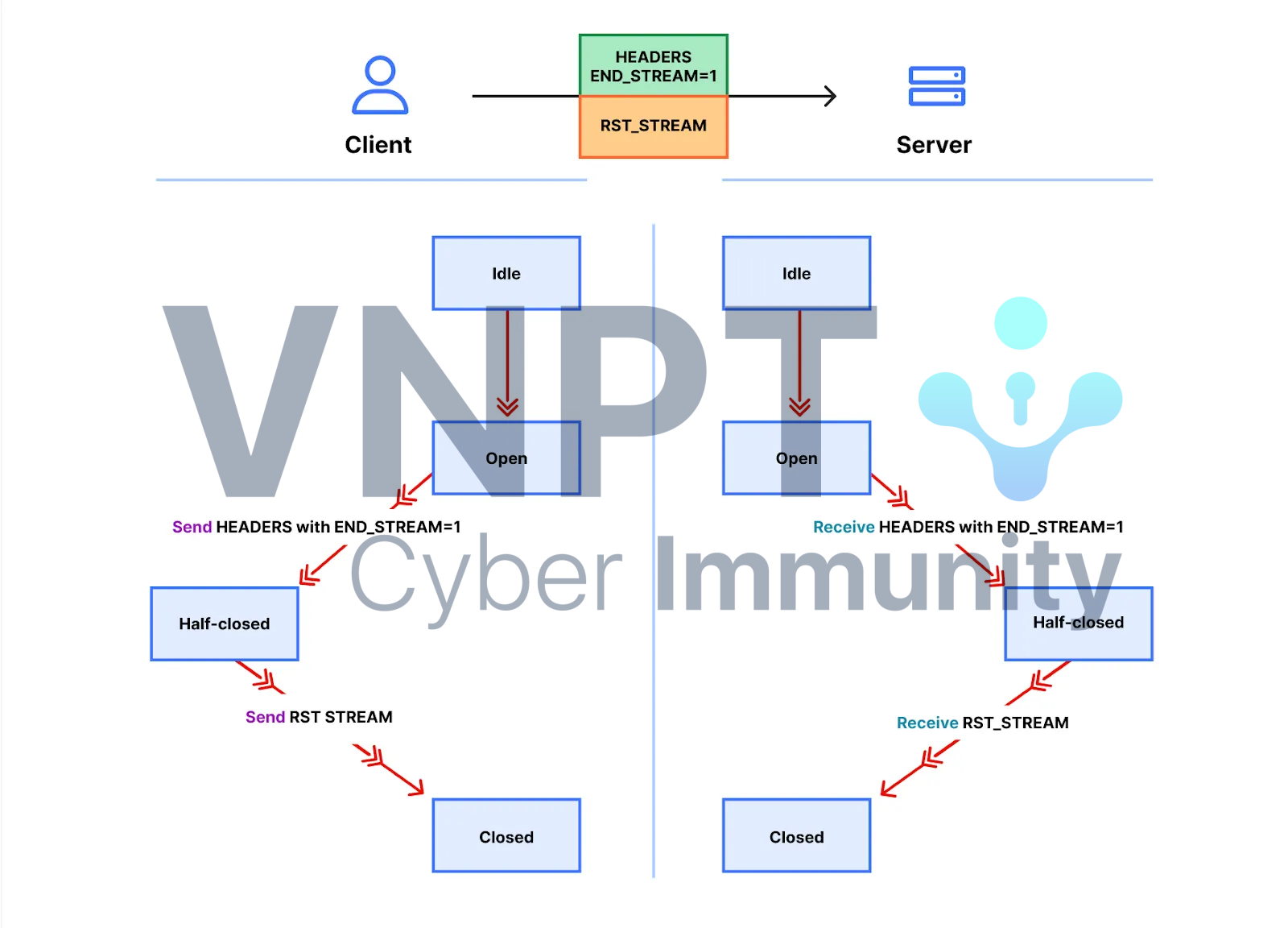 Khi client đã gửi frame HEADERS hoặc DATA với cờ END_STREAM, luồng chuyển sang trạng thái half-closed (remote). Nếu client tiếp tục gửi HEADERS hoặc DATA trên cùng luồng đó sau khi đã kết thúc phần gửi, đây là vi phạm giao thức và máy chủ phải trả lời bằng RST_STREAM với mã lỗi STREAM_CLOSED.