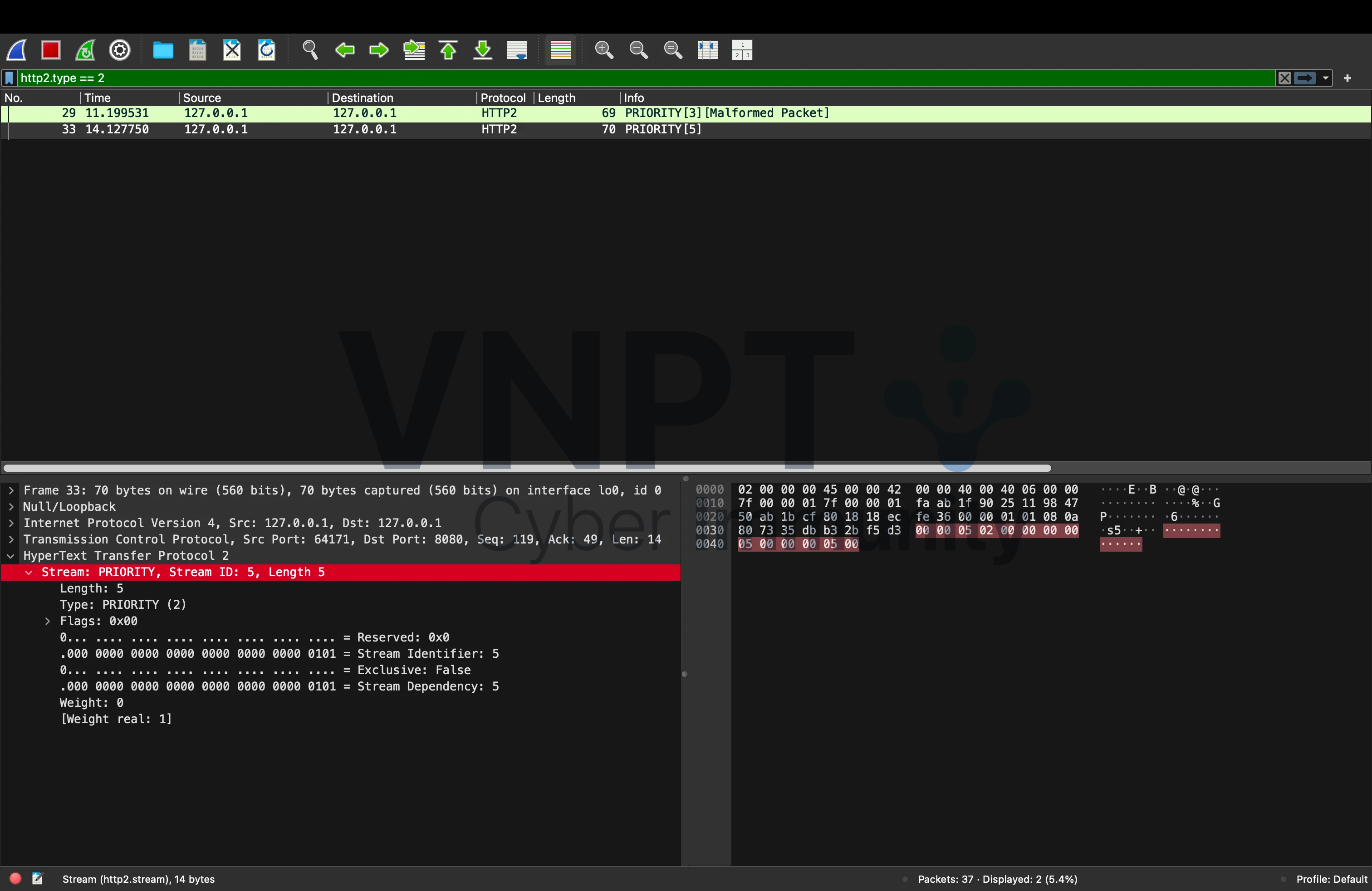 Đặc tả yêu cầu frame PRIORITY phải có độ dài đúng 5 octet. Nếu kẻ tấn công gửi PRIORITY với độ dài khác 5, đây là lỗi định dạng frame (framing error) và máy chủ cần reset luồng tương ứng.