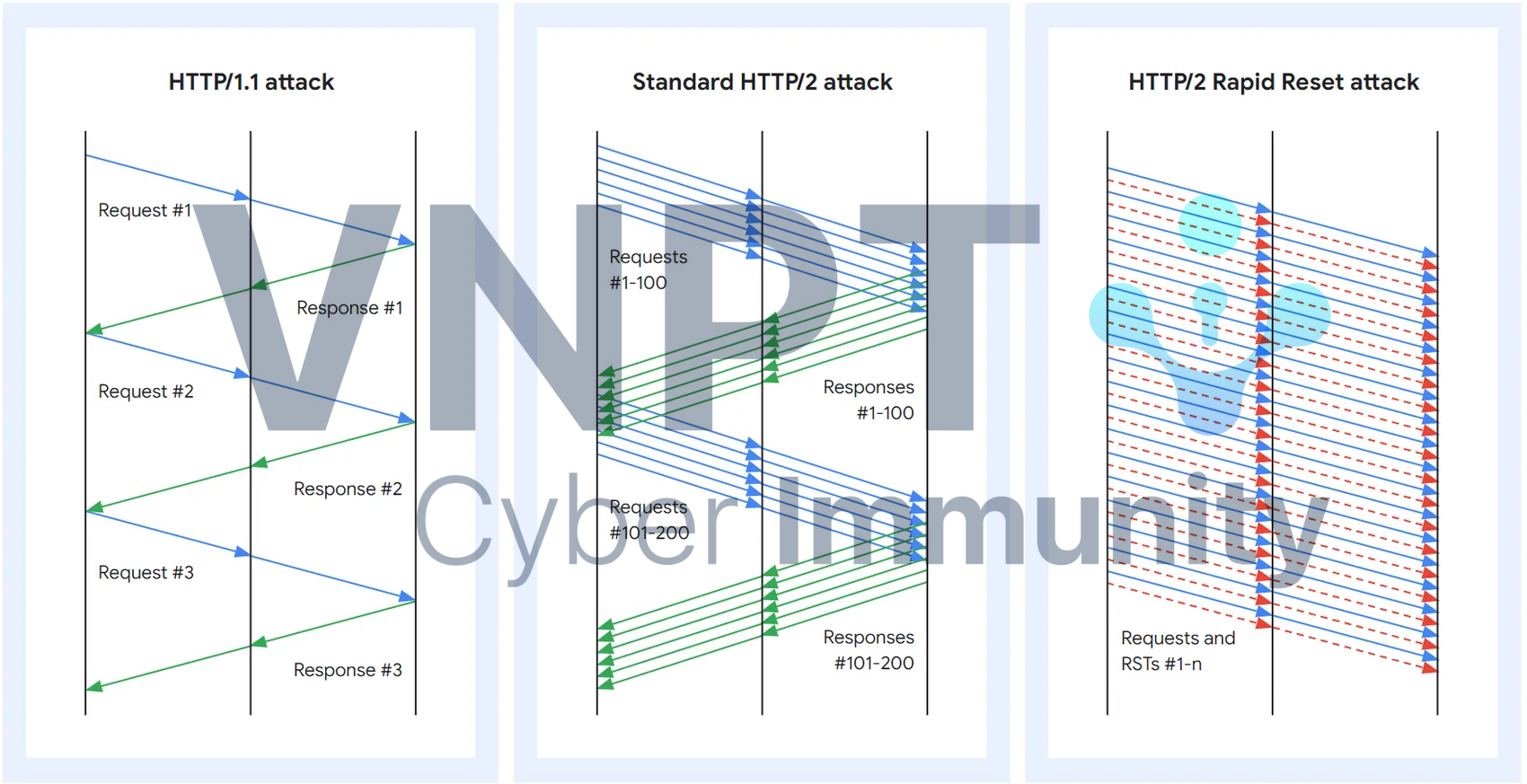 Khả năng Phát hiện | Tương đối dễ phát hiện bằng cách rate-limit RST_STREAM từ client | Khó phát hiện hơn, có thể hòa lẫn với lưu lượng hợp lệ |