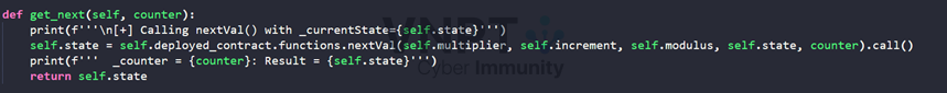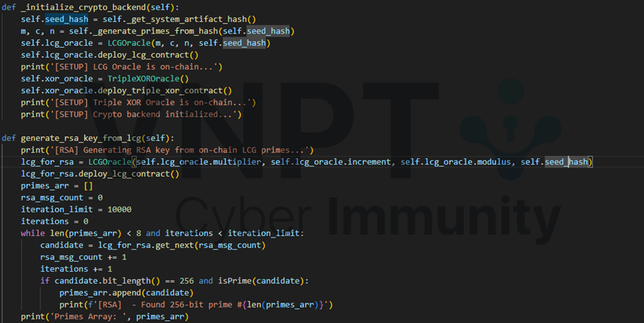 - RSA: implement RSA encrypt, with primes number generated by A Linear Congruential Generator (LCG) - a function also utilizes web3 contract, but this is not a standard LCG, it has additional condition check varg4 which is the counter value in python code.