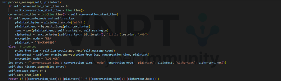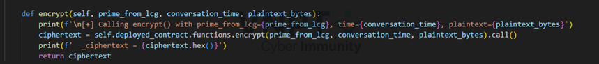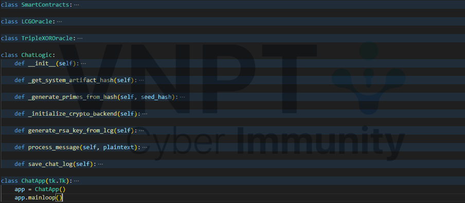 - LCG-XOR: save both plaintext and ciphertext in chat_log.json, encrypt function utilize web3 contract triple-xor with two key includes conversation_time and prime_from_lcg. The contract_bytes of the contract is hardcoded, it is a nested contract, the final decompiled solidity code for this encrypt is actual perform triple xor.