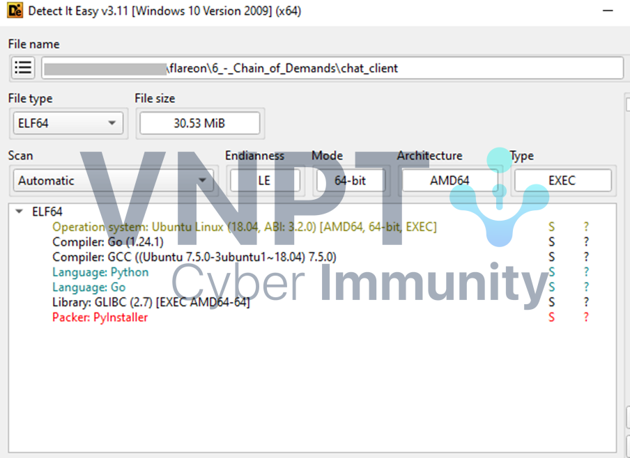 DiE detects this is an ELF file, which is packed by PyInstaller, the Go information might be misleading.