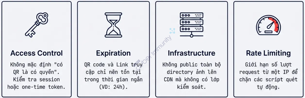 Trước hết, hãy ngừng sử dụng các ID tuần tự cho ảnh và tài nguyên, bởi đó gần như là lời mời công khai cho việc dò đoán và thu thập hàng loạt. Thay vào đó, việc sử dụng UUID hoặc token ngẫu nhiên đã đủ để loại bỏ phần lớn các kịch bản tấn công cơ bản. QR code cũng không nên chỉ đơn thuần là một đường dẫn “mở cửa tự do”, mà cần chứa token gắn với đúng tài nguyên, có thời hạn sử dụng rõ ràng, để người ngoài không thể truy cập vô hạn chỉ bằng cách giữ lại link.