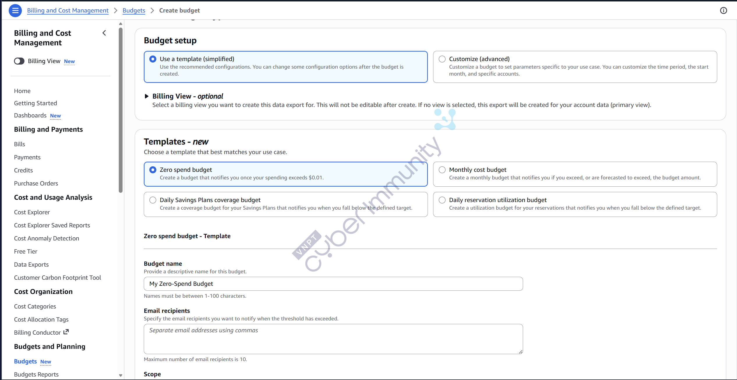 Vào AWS Console → Billing and Cost Management → Budgets → Create Budget, ae có thể chọn sẵn “Zero spend budget” template: