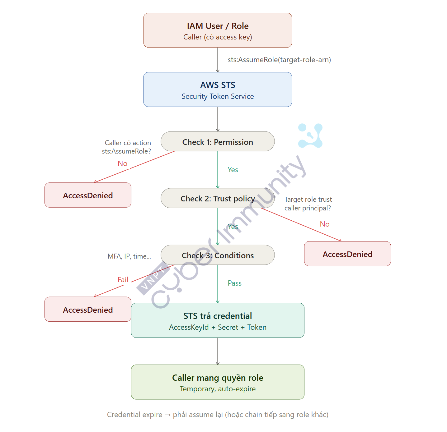 AssumeRole - User gọi STS → STS check trust policy + user permission → trả về temporary credential