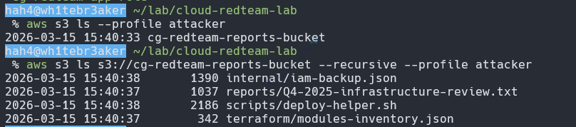 aws s3 ls --profile redteam-labQuan trọng: Luôn cleanup sau khi lab xong. Dù IAM/S3/STS free, nhưng để resource tồn tại = attack surface trên account lab của ae.